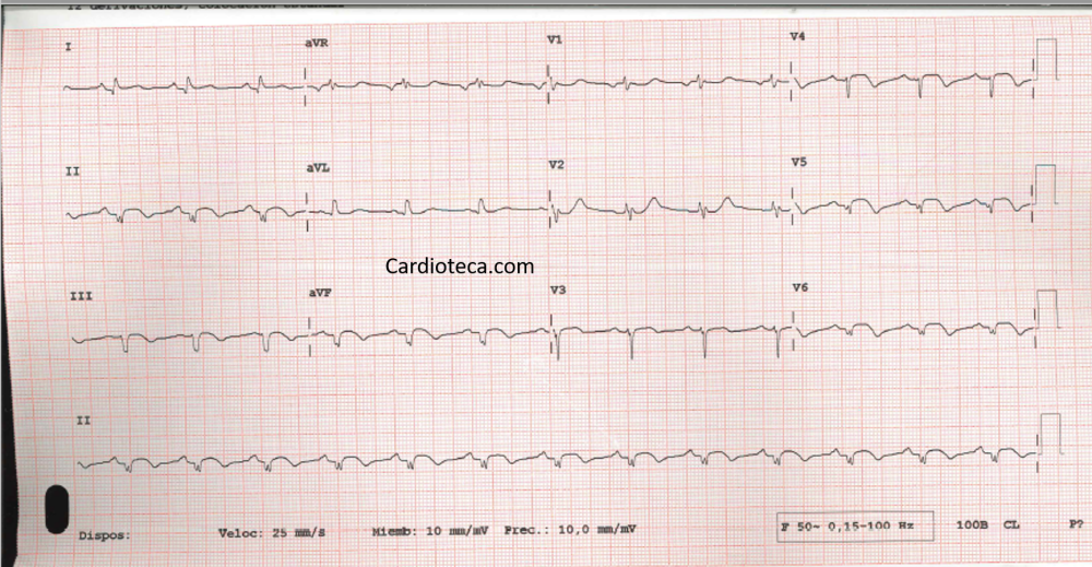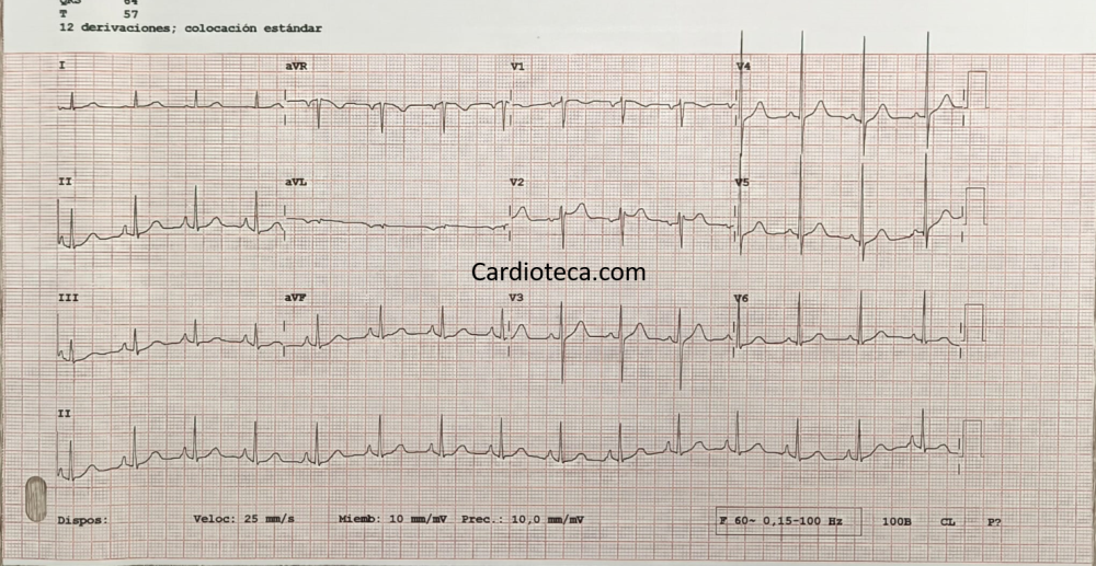 Caso 642 (04/08/2025). Paciente de 70 años. Hace años le hicieron un cateterismo y le dijeron que había una venita rara que funcionaba mal y no le hicieron ningún tratamiento porque no era peligroso. No tienes más informes. Ha tenido alguna revisión siempre con ECG normal. Hoy, estando asintomática, tiene este ECG. ¿Qué diagnóstico crees que tiene el paciente?
