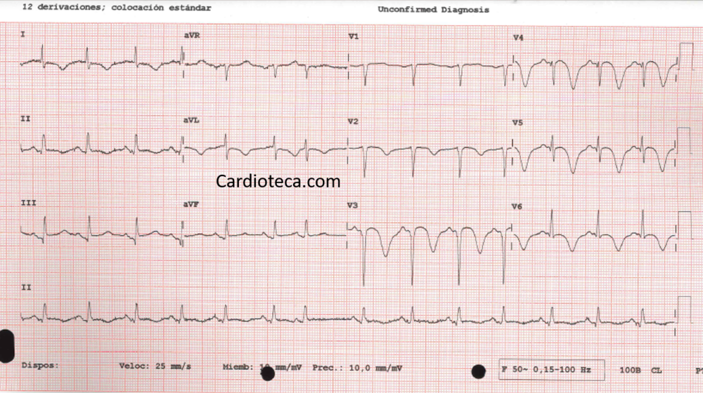 Caso 647 (08/09/2025). Paciente de 50 años, en tratamiento quimioterápico, que sale a la planta procedente de la unidad coronaria. Antes de leer el informe, tienen el ECG del ingreso en la planta que es 3-4 días posterior a su ingreso en la unidad coronario. ¿Qué crees que le ha pasado? ¿Qué función sistólica del VI esperas que tenga el paciente?