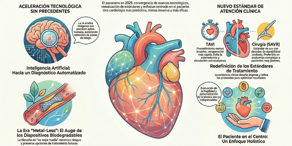 El panorama de la cardiología intervencionista y estructural en 2025 está definido por la convergencia de tres macrotendencias claras: la aceleración tecnológica, la redefinición continua de los estándares de tratamiento y la consolidación de un enfoque holístico y personalizado.